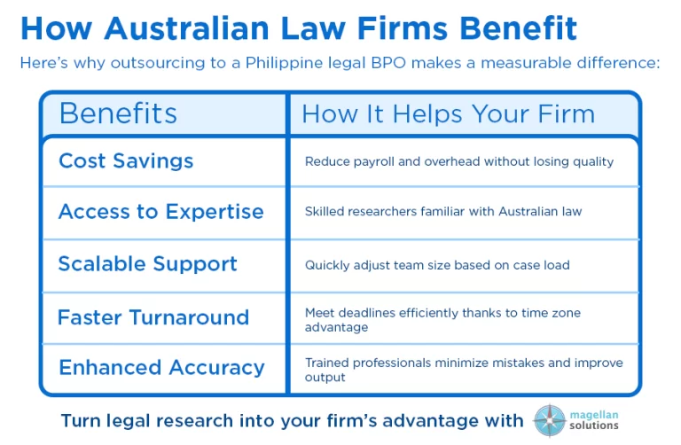 Outsourcing legal research is like having a behind-the-scenes powerhouse that ensures your firm never misses a deadline, provides precise, accurate insights, and frees your lawyers to focus on strategy and client outcomes. But why are Philippine-based BPO providers the go-to choice for Australian law firms?