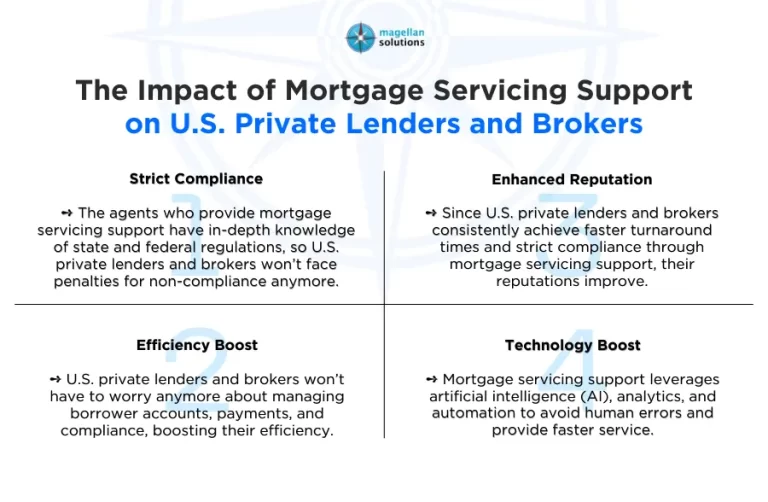 - Technology Boost: Mortgage servicing support leverages artificial intelligence (AI), analytics, and automation. Thus, U.S. private lenders and brokers won’t have to worry about human errors anymore. U.S. private lenders and brokers can expect faster service to serve their customers better.Â