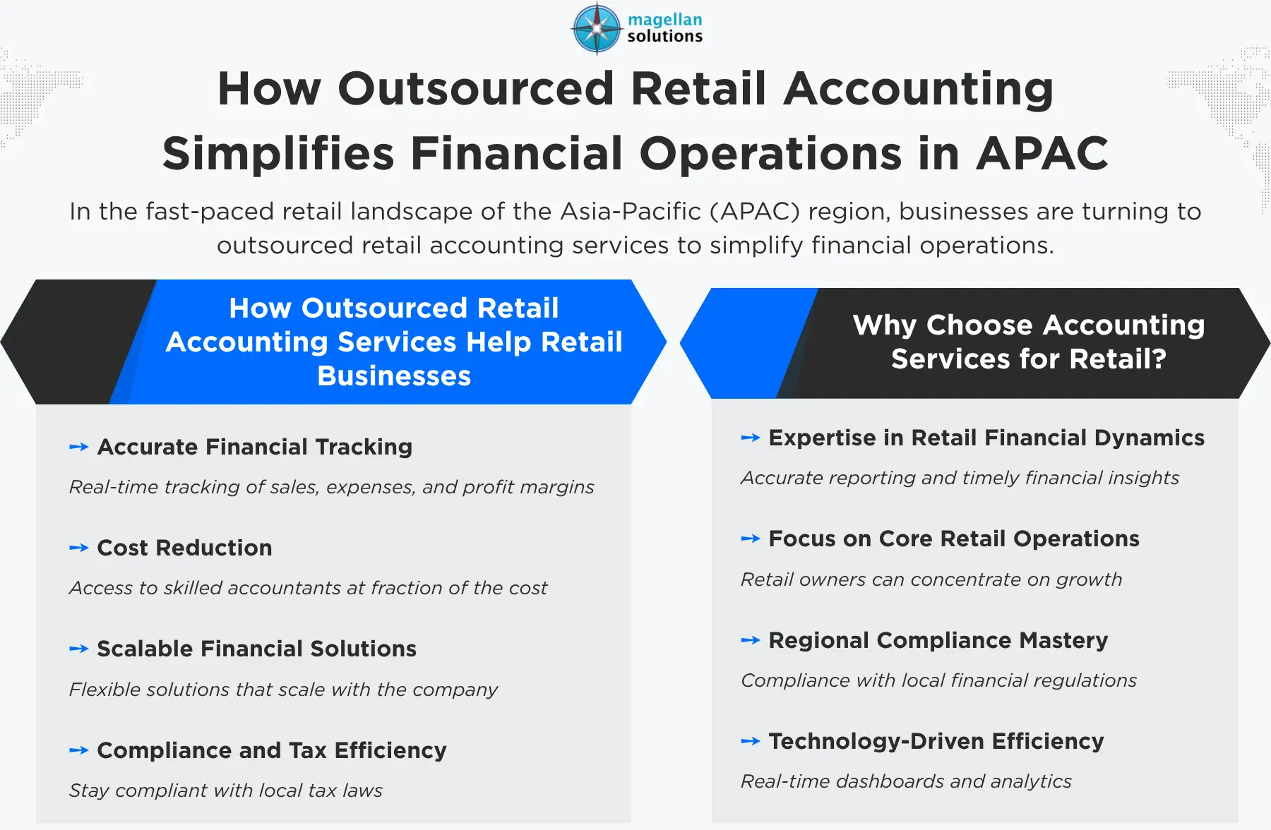 Let Magellan Solutions handle your accounting needs while you focus on growing your retail business. As a trusted accounting services provider for retail, Magellan Solutions helps APAC businesses streamline financial operations, ensure compliance, and make data-driven decisions.