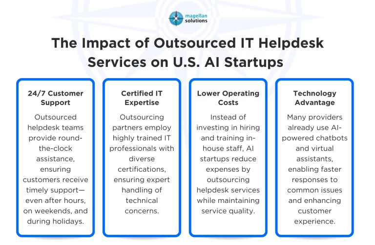 - Technology Boost: Most providers of outsourced IT helpdesk services already use AI-powered chatbots and virtual assistants. These technologies make it easier to respond to fundamental customer concerns. Thus, U.S. AI startups will benefit from this technology boost when they choose a reliable outsourcing partner.Â