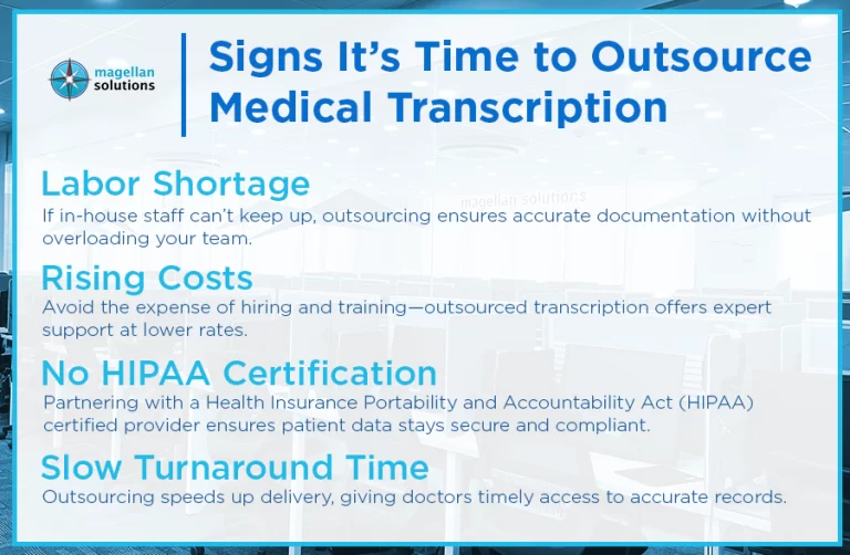 • Labor Shortage: When healthcare providers lack sufficient workers capable of accurate medical transcription, it is time to consider outsourcing. Healthcare providers cannot compromise the accuracy of medical transcription by giving this task to overwhelmed workers. Thus, it is a wise move for healthcare providers to outsource medical transcription to a reliable outsourcing partner.