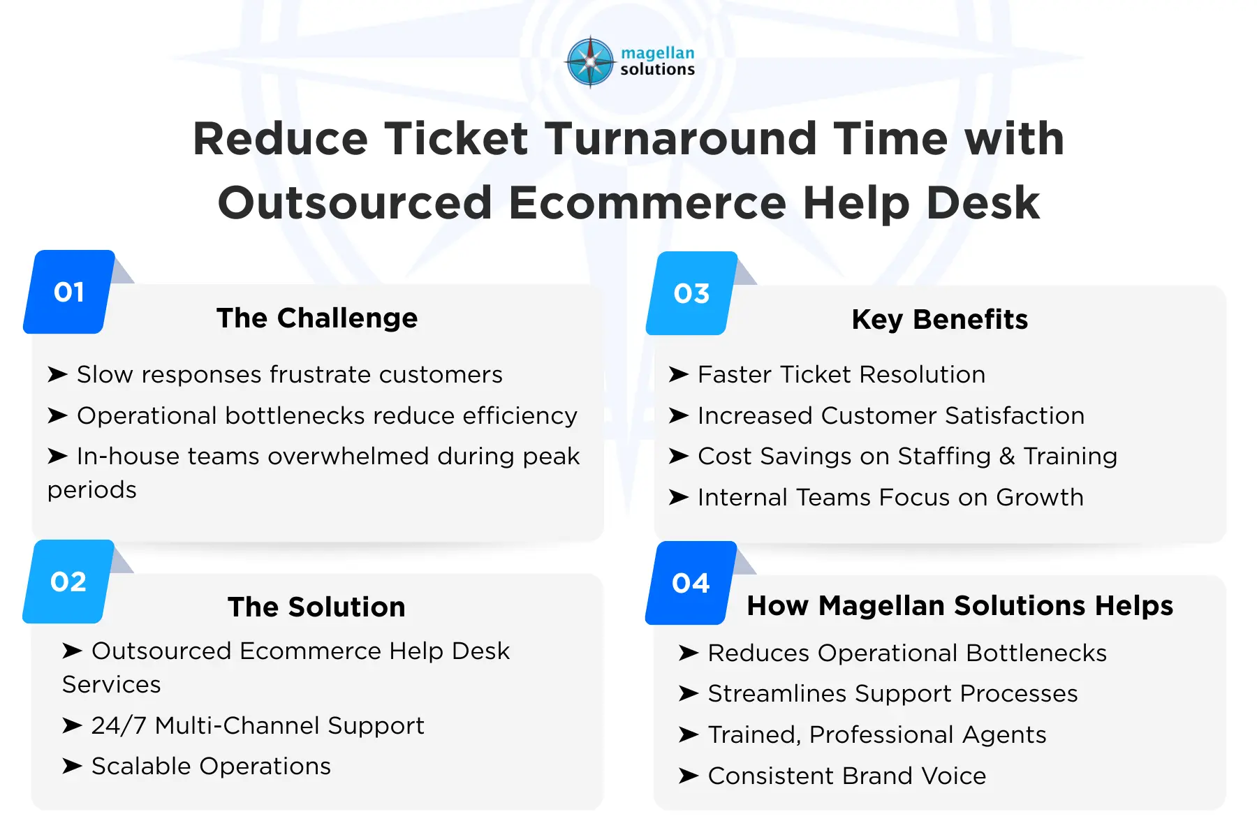 Ecommerce help desk outsourced services allow businesses to delegate customer support responsibilities to specialized providers like Magellan Solutions. This ensures that brands can maintain operational efficiency, reduce overhead costs, and focus on core business growth while customers receive timely support.