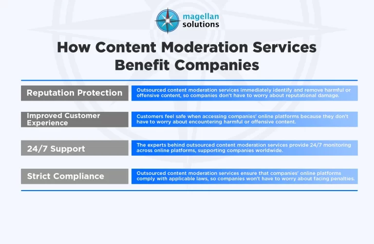 • Improved Customer Experience: Customers feel safe when accessing companies’ online platforms. Customers don’t have to worry about encountering harmful or offensive content, thanks to outsourced content moderation services​. Thus, companies will have more loyal customers over the long term as a result of improved customer experience.
