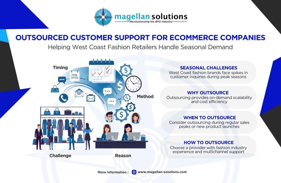 Outsource customer support for ecommerce companies — when seasonal demand hits, West Coast fashion brands know the drill—website traffic spikes, inventory moves fast, and customer inquiries pour in nonstop. What often gets overlooked, though, is how quickly ecommerce customer support can become overwhelmed when interest surges. It’s not that retailers aren’t prepared; it’s that fashion cycles move fast, and customer expectations move even faster.