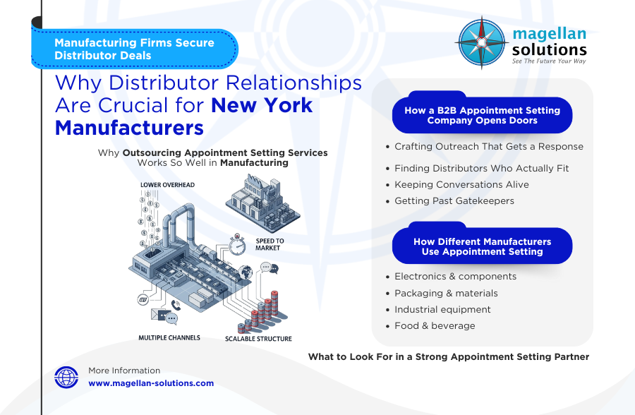 New York’s manufacturing scene is anything but small. From industrial machinery and aerospace parts to food products and custom manufacturing, the industry is full of companies ready to grow—but many hit the same snag: getting in front of the right distributors. That’s where outsourcing appointment setting services becomes more than just a convenience—it’s a growth strategy.