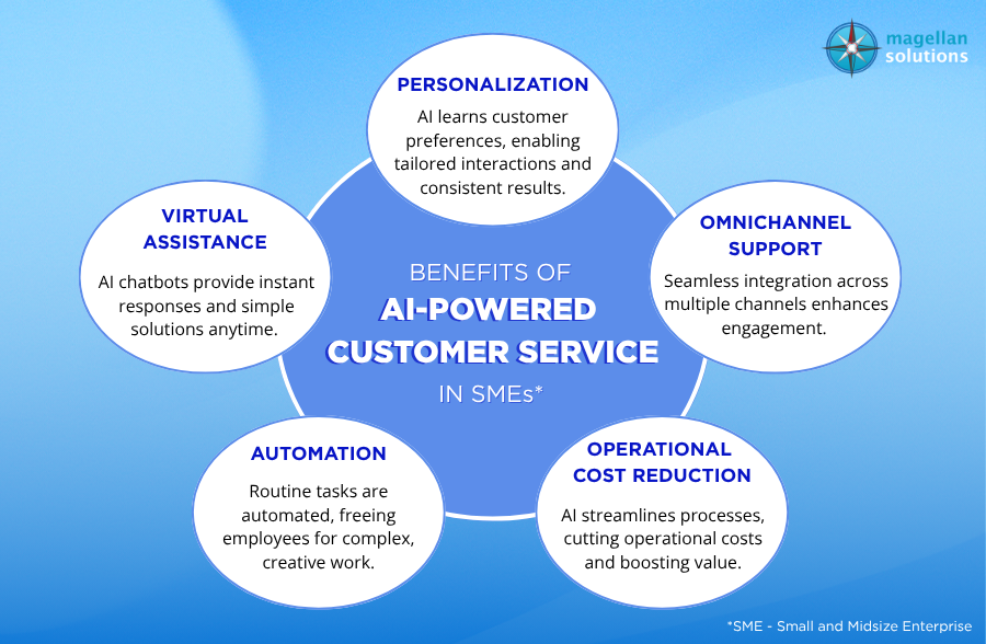 - Omnichannel support: AI enables SMEs to effectively integrate data from various sources. In short, this means that their customers will now be able to choose and switch between channels without delays, leading to increased engagement and satisfaction.