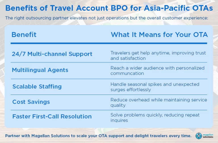 Outsourcing customer-facing operations isn’t just a theory, according to a study; companies that strategically outsource report cost savings while maintaining service quality. For Asia-Pacific OTAs, this means higher booking volumes can be handled efficiently, without compromising on traveler satisfaction—a crucial edge in a competitive market.