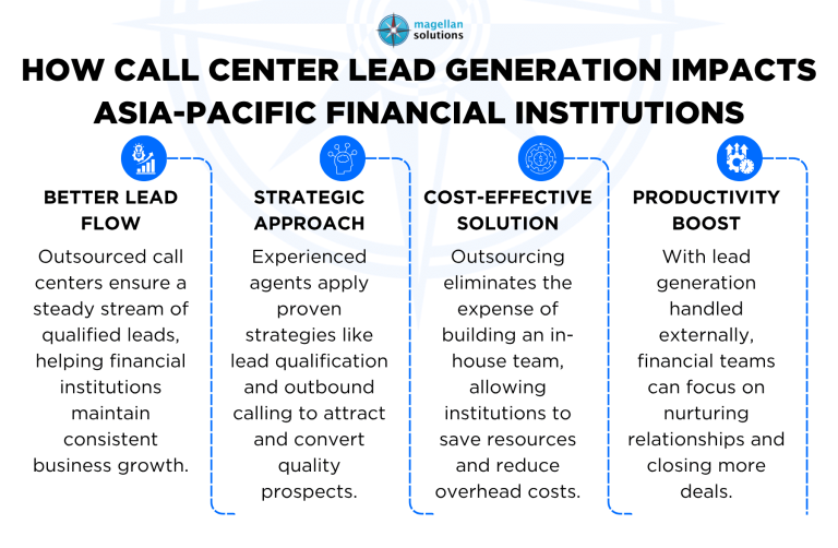 - Productivity Boost: When Asia-Pacific financial institutions still have to handle lead generation tasks, this takes away a significant amount of their precious time. Thus, it would be much better if Asia-Pacific financial institutions choose the outsourcing route. Hiring a credible provider of lead generation call center services can give Asia-Pacific financial institutions a much-needed productivity boost. Asia-Pacific financial institutions can just concentrate on closing deals.Â