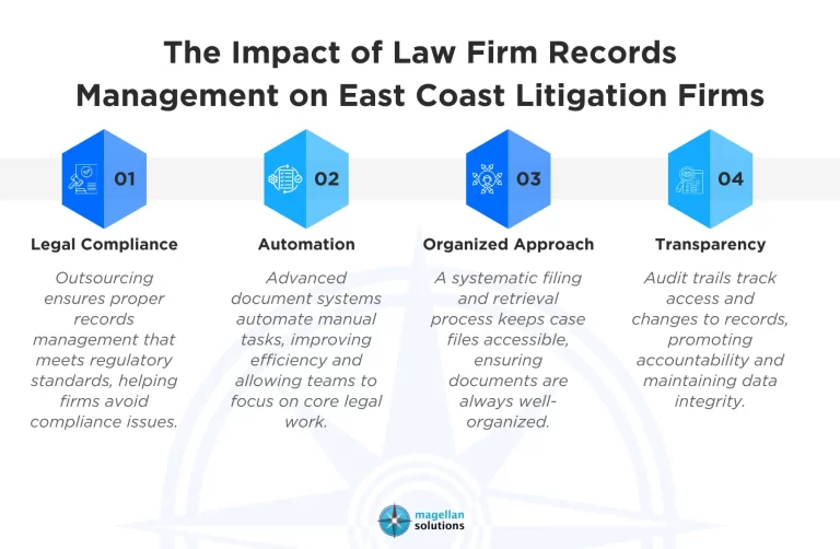 - Automation: Most providers of law firm records management services already have advanced document management systems that enable automation. Thus, East Coast litigation firms can expect a significant efficiency boost through outsourcing. East Coast litigation firms will have more time to concentrate on other core activities once they become more efficient. Â