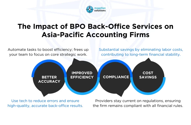 - Compliance: BPO back-office service providers can help Asia-Pacific accounting firms consistently maintain full compliance. These providers are always aware of the latest developments in financial rules and regulations. Thus, Asia-Pacific accounting firms have nothing to worry about regarding compliance issues anymore.Â