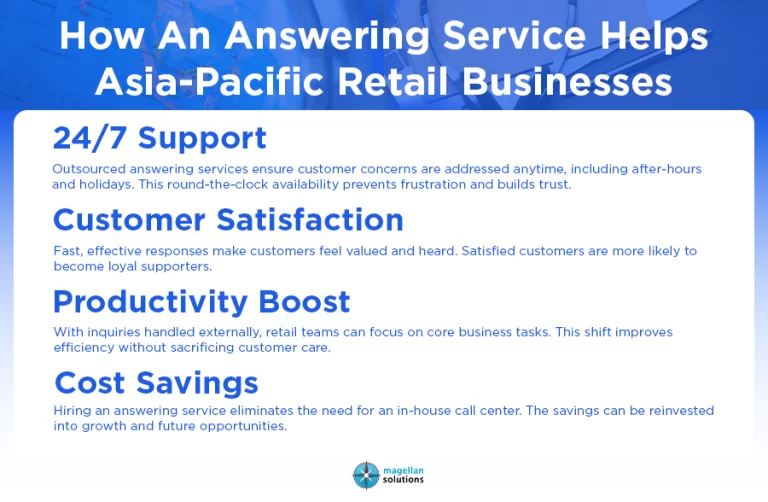 - Productivity Boost: Since an outsourcing provider of an answering service already handles customer inquiries, Asia-Pacific retail businesses will become more productive. These businesses don’t have to worry about losing customers just because of failing to address their concerns. Instead, Asia-Pacific retail businesses can now focus on other essential core activities.