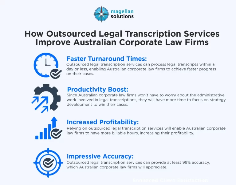 - Productivity Boost: Since Australian corporate law firms won’t have to worry about the administrative work involved in legal transcriptions, they can expect to become more productive. Relying on outsourced legal transcription services will enable Australian corporate law firms to focus more on strategy development to win their cases.Â