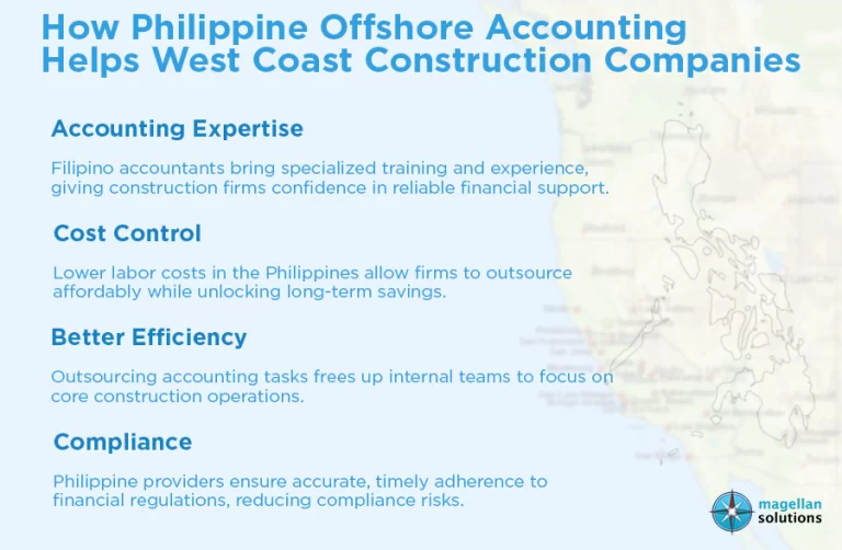 - Compliance: Providers of offshore accounting in the Philippines understand the importance of strict compliance with financial regulations. Accurate and timely compliance with financial regulations is essential. West Coast construction companies can rest assured that they will not violate any financial regulations when outsourcing to the Philippines.Â